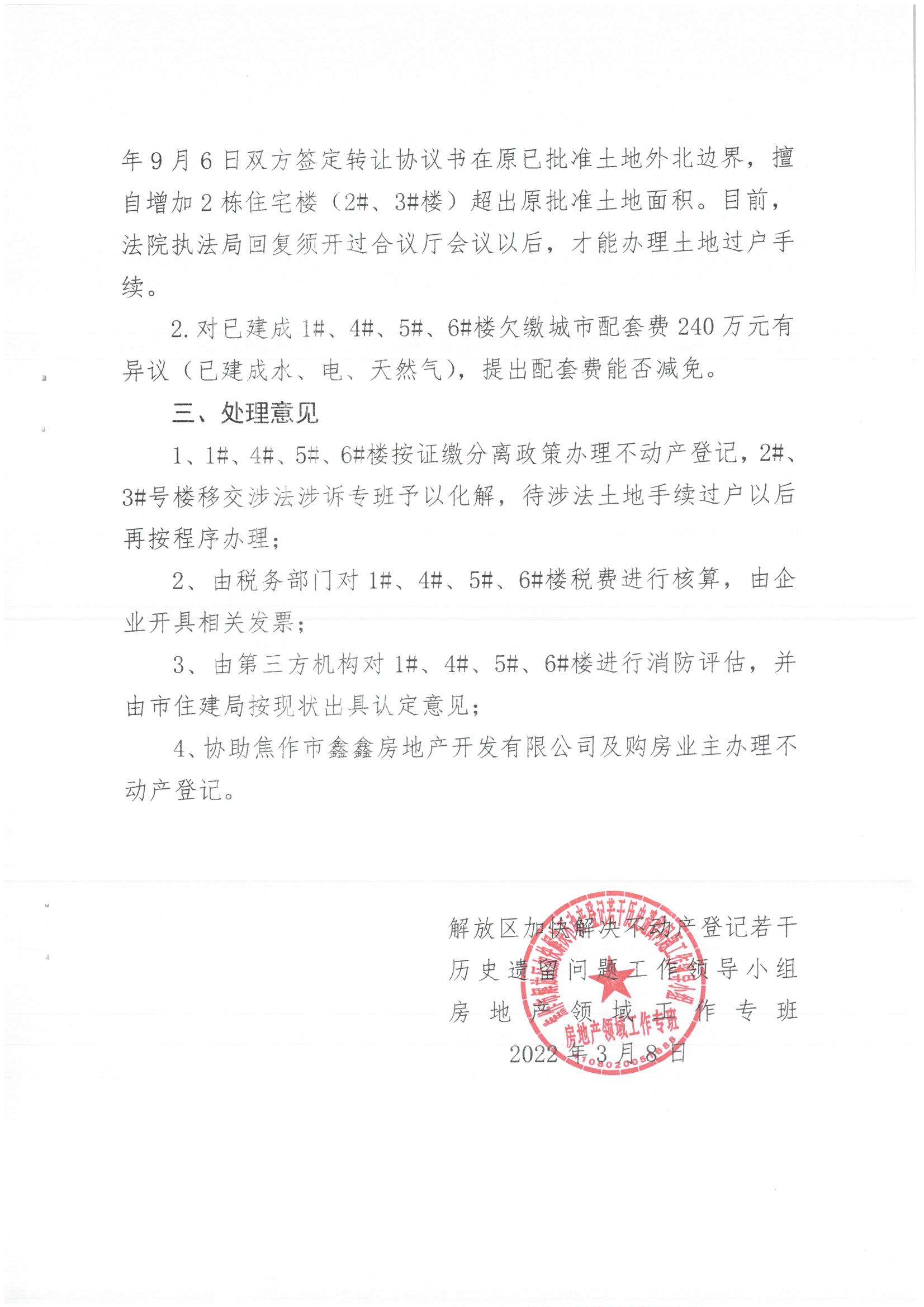 《方案》從工作原則、適用范圍、組織保障、處理程序、處理辦法、保障措施、工作要求7個方面明確了解決不動產(chǎn)登記歷史遺留問題的政策措施及工作安排。提出堅持“無錯優(yōu)先”原則,將為群眾辦理登記與為企業(yè)補(bǔ)辦手續(xù)并行辦理;成立涉法涉訴、工業(yè)企業(yè)和房地產(chǎn)領(lǐng)域3個工作專班,重點(diǎn)解決用地、規(guī)劃、竣工驗(yàn)收、稅費(fèi)繳納、開發(fā)主體滅失等10個方面手續(xù)問題。制定了30條政策措施,對涉及“證繳分離”等復(fù)雜、重大、特殊問題,重點(diǎn)采取“一事一議、一樓一策、一企一策”的工作議事決策機(jī)制,實(shí)行“盡責(zé)容錯、履職免責(zé)”以及聯(lián)合懲戒的追責(zé)問責(zé)懲處機(jī)制,解決完善相關(guān)手續(xù)和登記問題。